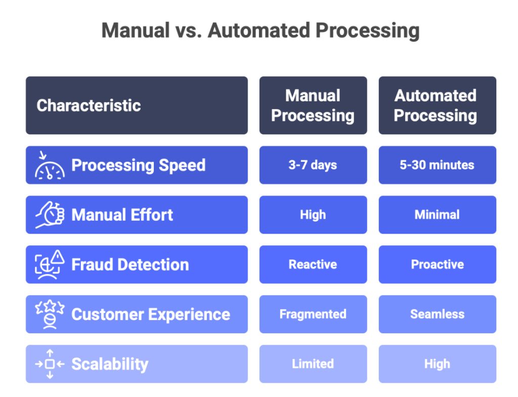 Complete automation doesn’t mean eliminating human judgment entirely. Edge cases still route to manual review, including data mismatches between different sources, suspected fraud requiring investigation, and policy exceptions that fall outside normal parameters. This human-in-the-loop approach ensures speed without sacrificing control or judgment.